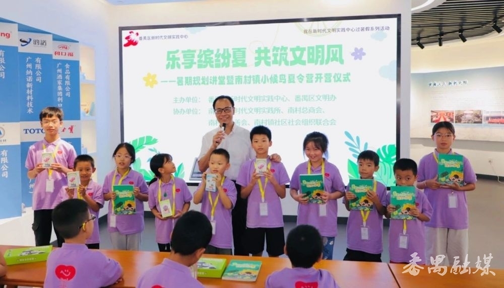 7月22日,番禺区新时代文明实践中心内气氛热烈。“乐享缤纷夏 共筑文明风——我在新时代文明实践中心过暑假”活动暨“五社携手护童心,青春筑梦共成长”2025年南村镇“小候鸟”夏令营开营仪式在这里拉开帷幕。活动上,主、协办单位领导共同为“小候鸟”派发《文明礼仪》等书籍和文具礼品,宣布南村镇“小候鸟”夏令营正式启动。随后,“兔爸”吴铭枝为在场的“小候鸟”带来了诚意满满的精彩课程,从手机管理、心理调适、社会实践到家庭陪伴等进行层层剖析。