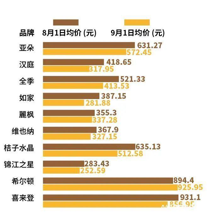 “酒店价格指数”课题组对比8月1日-9月1日的数据发现:覆盖北京、上海、广州、深圳四大一线城市的酒店价格,在8月1日旅游旺季至9月1日开学季淡季期间呈现普遍回调趋势。在课题组观察的10个酒店品牌中,9个出现均价下降,仅希尔顿一家逆势上涨。