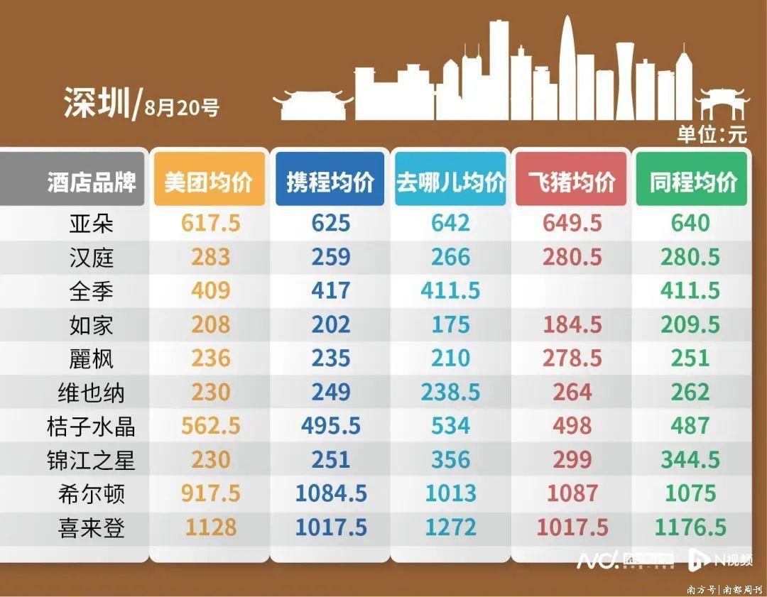 具体来看,在美团平台上,维也纳(沙井上南店)8月20日与9月1日的单人间价格均为188元,桔子水晶(罗湖口岸国贸)8月20日的价格(532元)比9月1日的价格(580元)更低,锦江之星(皇岗口岸地铁站)8月20日价格(218元)比9月1日的价格(286元)更低,喜来登(深圳博林天瑞)8月20日价格(1261元)比9月1日的价格(850元)更低。