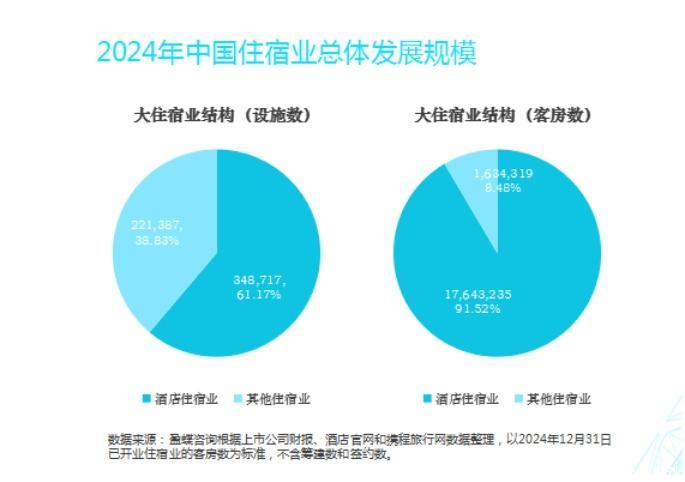 根据盈碟咨询和国泰君安证券研究数据和《2025中国酒店业发展报告》,我国酒店数量曾在2018、2019年达到约34万家的峰值。虽然受疫情影响,2020至2022年间总量一度降至25.2万家,但行业强劲反弹,截至2024年年底,中国住宿业设施总数为57万家,客房总规模19.27万间。其中酒店业设施34.87万家,客房总数17.64万间。